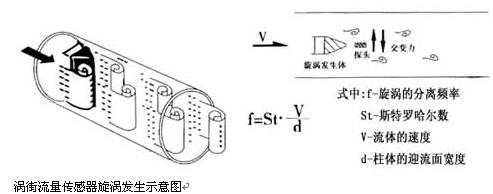 一定雷諾數(shù)范圍內(nèi)(2×104~7×106 ),旋渦的釋放頻率f與流體流速V及旋渦發(fā)生體的迎流面寬度d之間關(guān)系式為f=St?v/d,式中St為斯特勞哈數(shù),它是一個(gè)無量綱的系數(shù),只要準(zhǔn)確測出頻率f,就可以求得流體流速v,由v求出體積流量。
